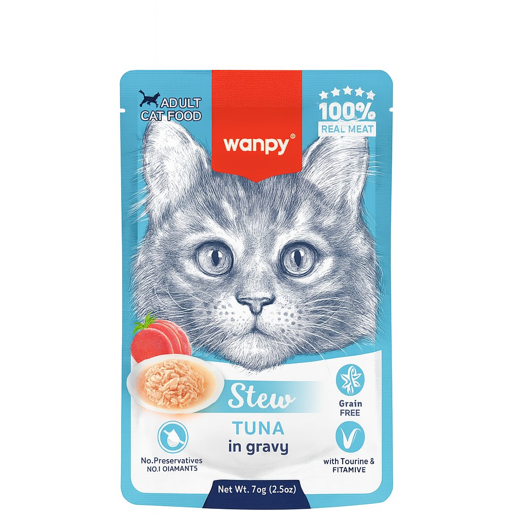 پوچ گربه ونپی (Wanpy) مدل Stew Tuna in Gravy یک غذای کامل و خوشمزه برای گربههای بالغ است. این محصول با گوشت واقعی تن تهیه شده و در سس گراوی (gravy) سرو میشود که هضم آسان و طعم لذیذی برای گربه فراهم میکند.