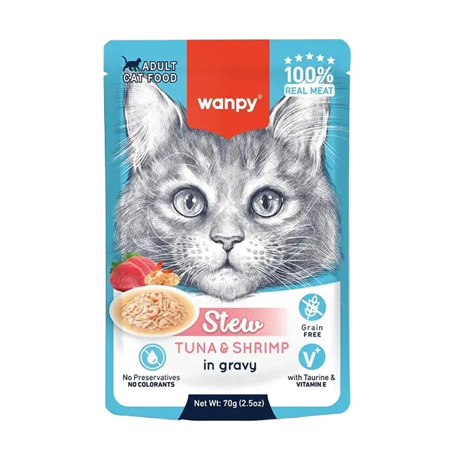 پوچ گربه ونپی (Wanpy) مدل Tuna & Shrimp یک غذای کامل و خوشطعم برای گربههای بالغ است که با ترکیبی از ماهی تن و میگو در سس (Gravy) تهیه شده است. این محصول سرشار از پروتئین حیوانی باکیفیت بوده و به حفظ انرژی و سلامت عمومی گربه کمک میکند.