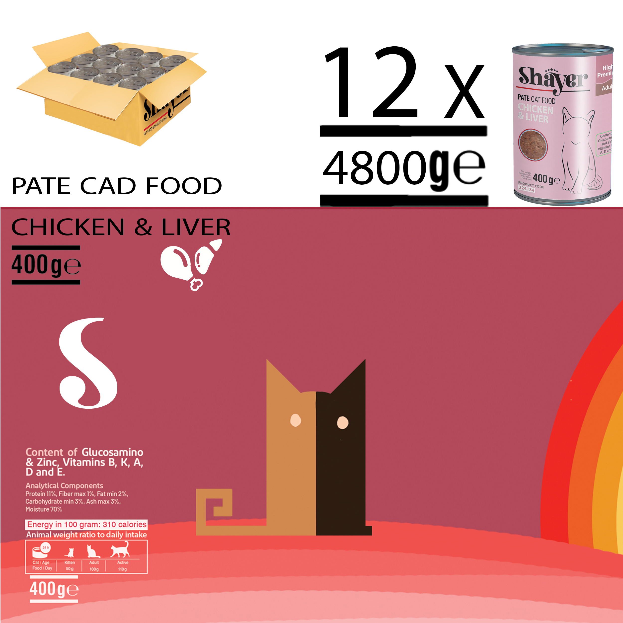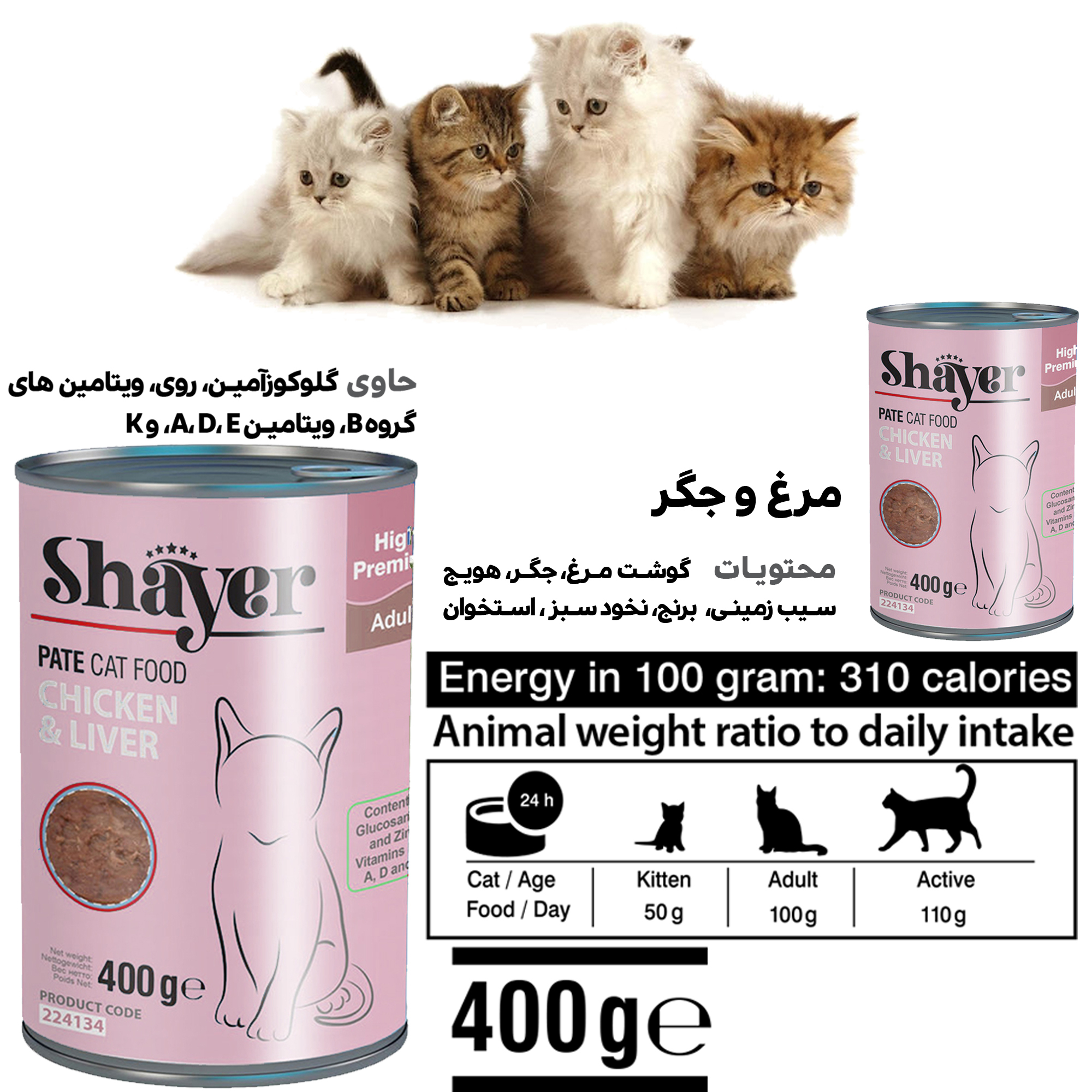 کنسرو گربه شایر با طعم مرغ و جگر با کمی برنج، هویج، نخود سبز، کلم و استخوان حاوی پروتئین، آهن، روی، مس، منگنز، سلنیوم، فسفر، ویتامینهای گروه B، ویتامینهای D, C, A و E می باشد. این کنسرو با توجه به داشتن پروتئین و فیبر لازم و مواد مغذی کاملا طبیعی برای تمامی سنین مناسب است.