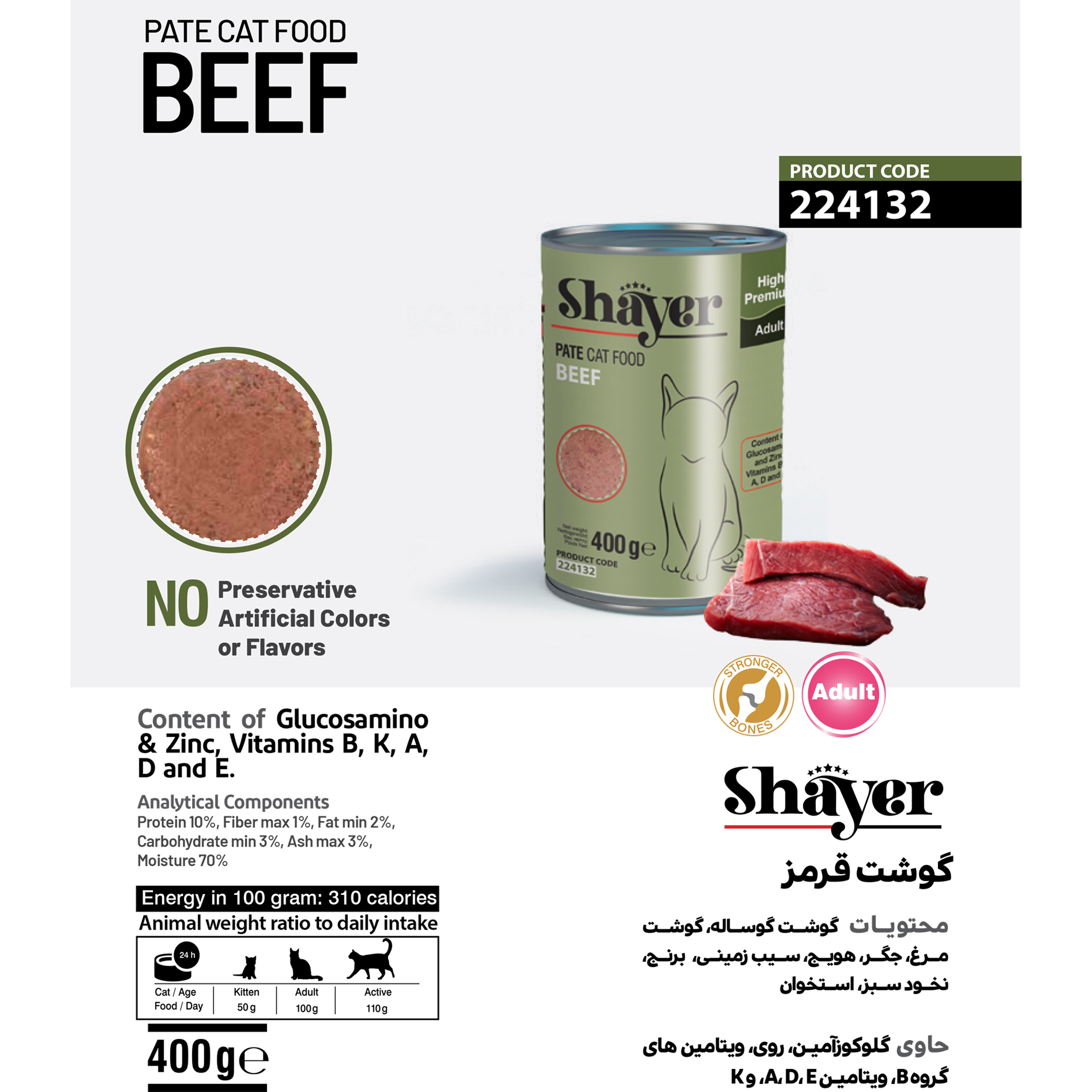 کنسرو گربه شایر با طعم گوشت قرمز حاوی امولسیون یکنواخت شدهی گوشت قرمز همراه با جگر، کمی برنج، هویج، نخود سبز، کلم و استخوان و حاوی انواع مختلفی از ویتامینهای مربوط به خانوادهی ویتامین B است که کمک کنندهی موثری برای عملکرد قلب، دستگاه عصبی مرکزی و کبد میباشد. این کنسرو با توجه به داشتن پروتئین و فیبر لازم و مواد مغذی کاملا طبیعی برای تمامی سنین مناسب است.