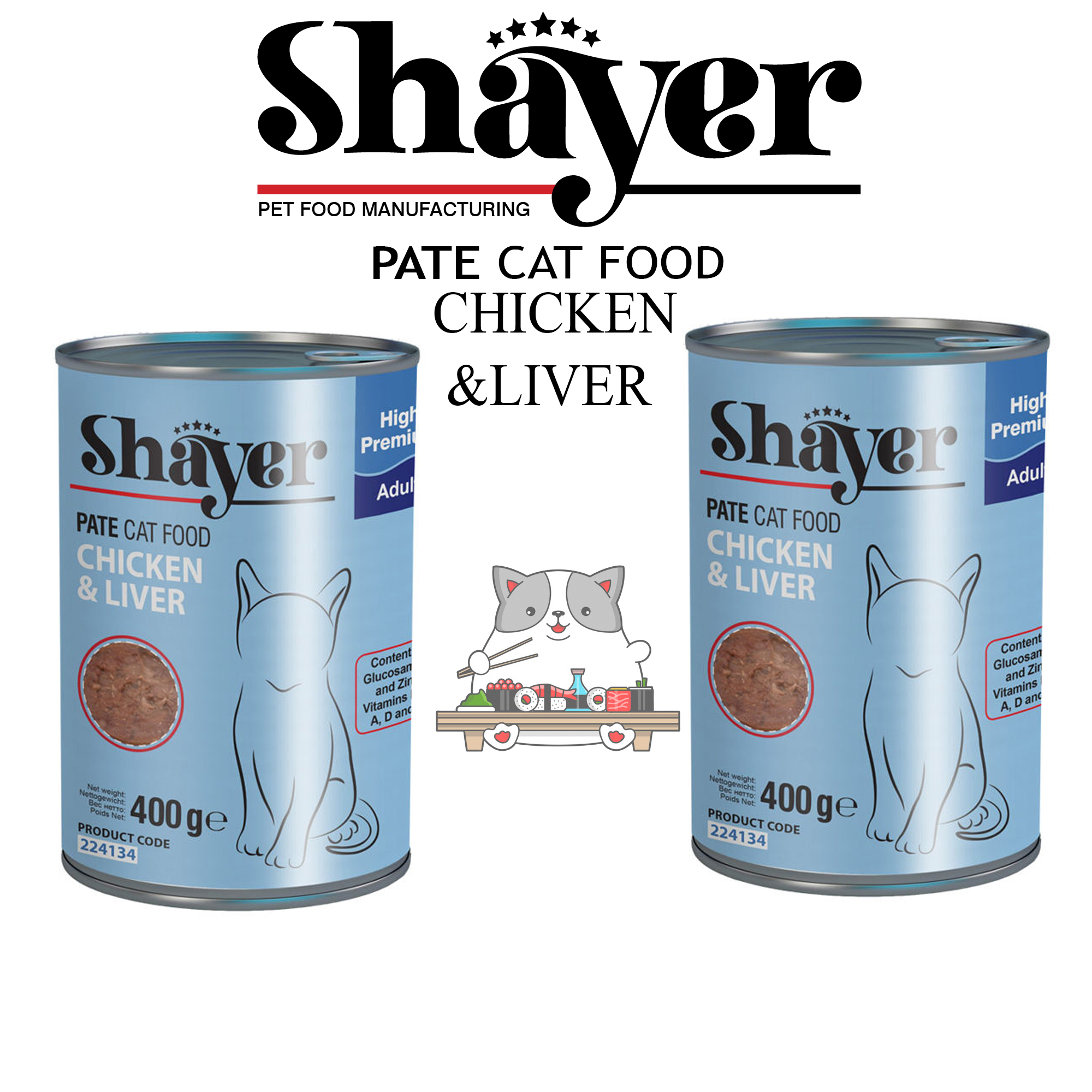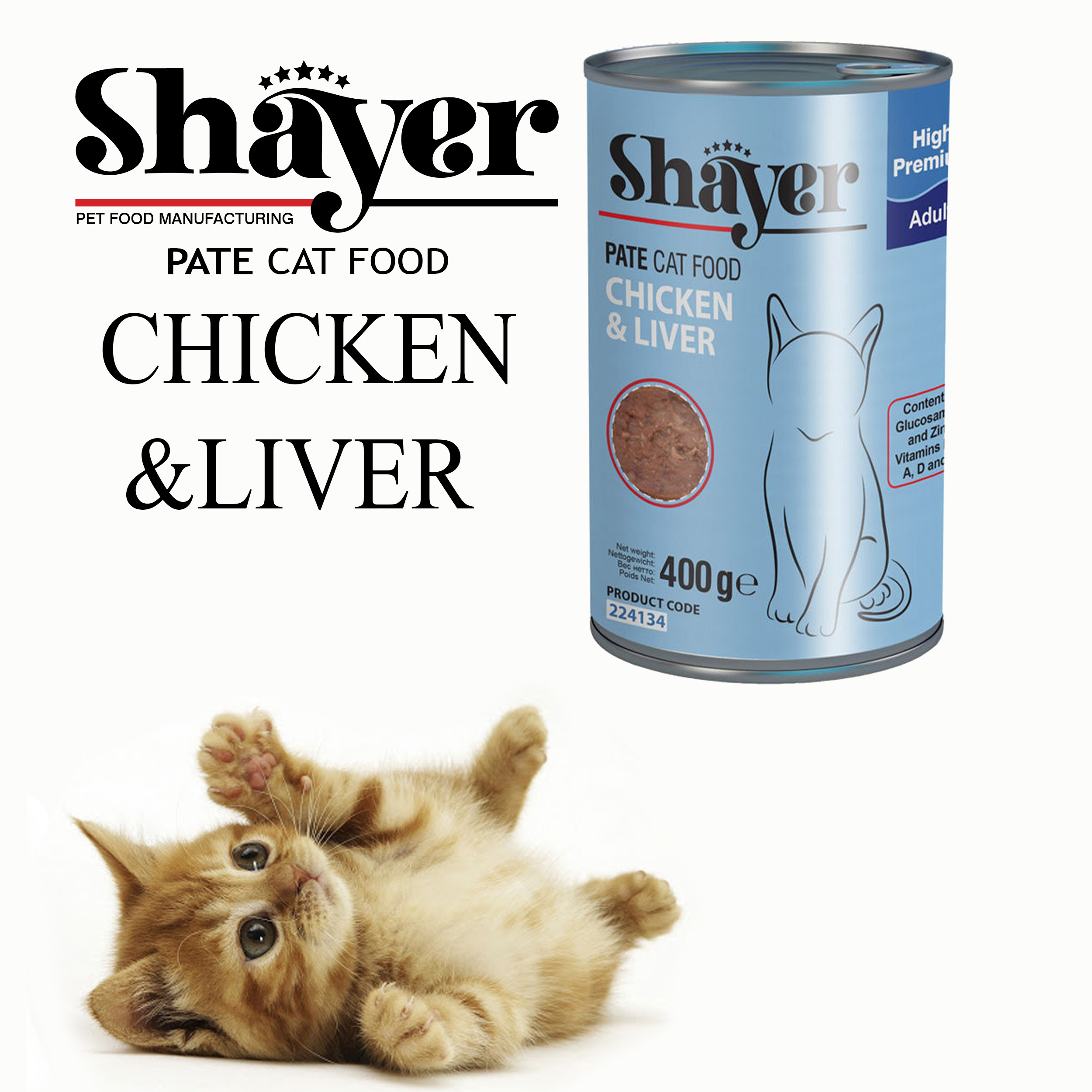 کنسرو گربه شایر با طعم مرغ و جگر با کمی برنج، هویج، نخود سبز، کلم و استخوان حاوی پروتئین، آهن، روی، مس، منگنز، سلنیوم، فسفر، ویتامینهای گروه B، ویتامینهای D, C, A و E می باشد. این کنسرو با توجه به داشتن پروتئین و فیبر لازم و مواد مغذی کاملا طبیعی برای تمامی سنین مناسب است.