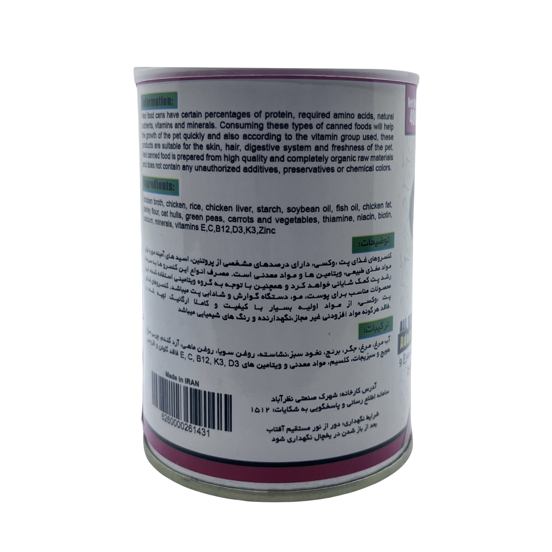 غذاهای مرطوب وکسی دارای تنوع و گستردگی بالا بوده و شما میتوانید به راحتی بسته به ذائقه و میل پت محصول مورد نظر خود را انتخاب کنید این محصول دارای فرمولی متعادل و کامل از تمام مواد مورد نیاز برای پت بوده و همچنین شامل انواع ویتامین ها و مواد معدنی میباشد که منجر به تقویت پوست و مو و شادابی پت میگردد. کنسروهای وکسی را میتوان به صورت مکمل و غذای اصلی استفاده کرد این کنسروها دارای ترکیبات فیبر خام، مقدار زیادی رطوبت ،روی ،کلسیم و ید و بیوتین میباشند که در درمان ریزش مو بسیار موثر میباشد و همچنین حاوی تورین بوده که به تقویت بینایی و حفظ سلامت قلب کمک میکند. این محصول غذایی کاملا با کیفیت و طبیعی و با مواد اولیه تازه بدون مواد نگهدارنده و بر اساس آخرین یافته های علمی متانسب با نیازهای تغذیه ای پت شما طراحی گردیده است. مواد اولیه بکار رفته برای تولید این محصول در پروسه های آهسته و با حفظ خواص مواد آماده شده است. کنسروهای وکسی تهیه شده از مواد ارگانیک طعمی بسیار جذاب و بویی مطبوع برای پت شما داشته و تقریبا حتی بدغذاترین پت ها نیز آن را دوست خواهند داشت