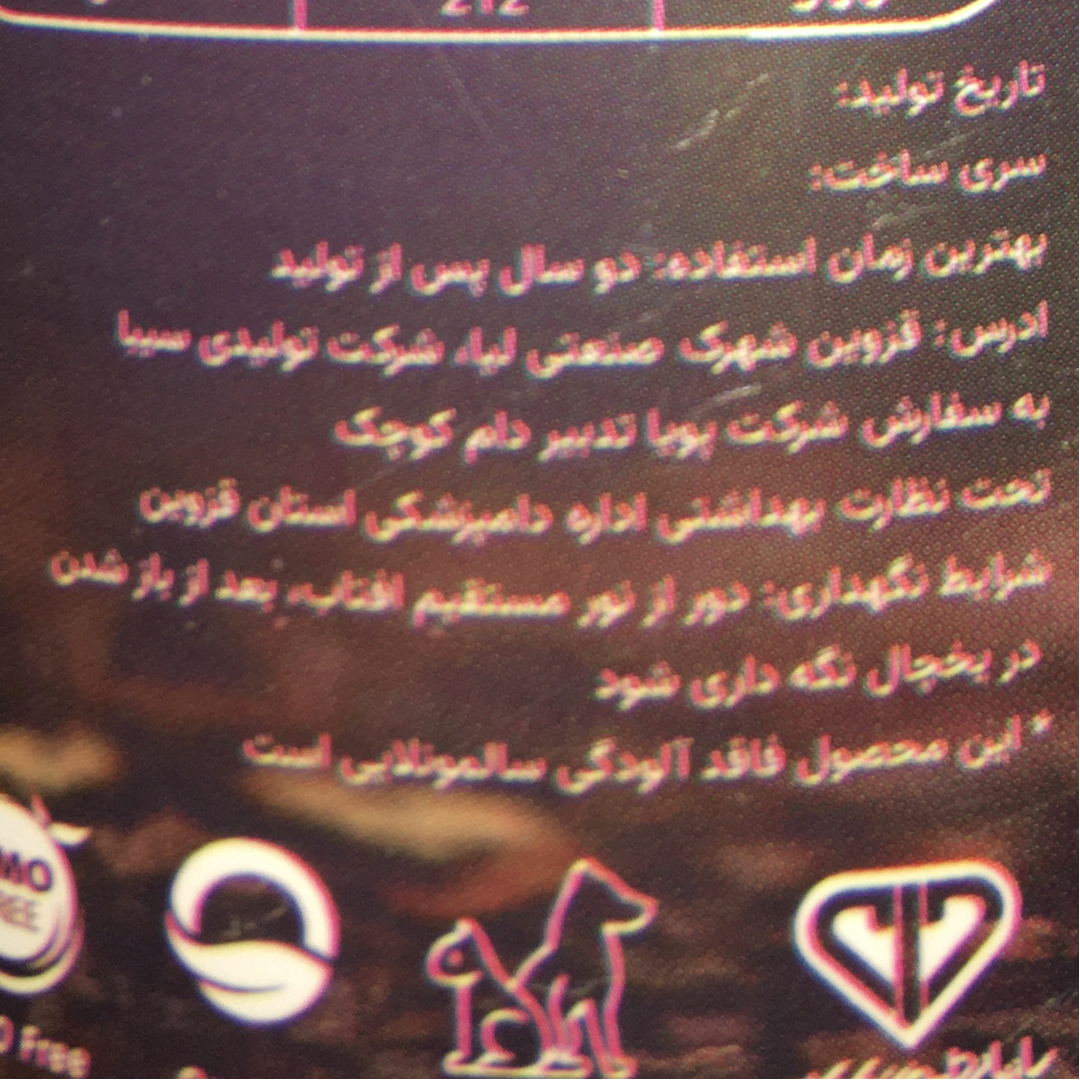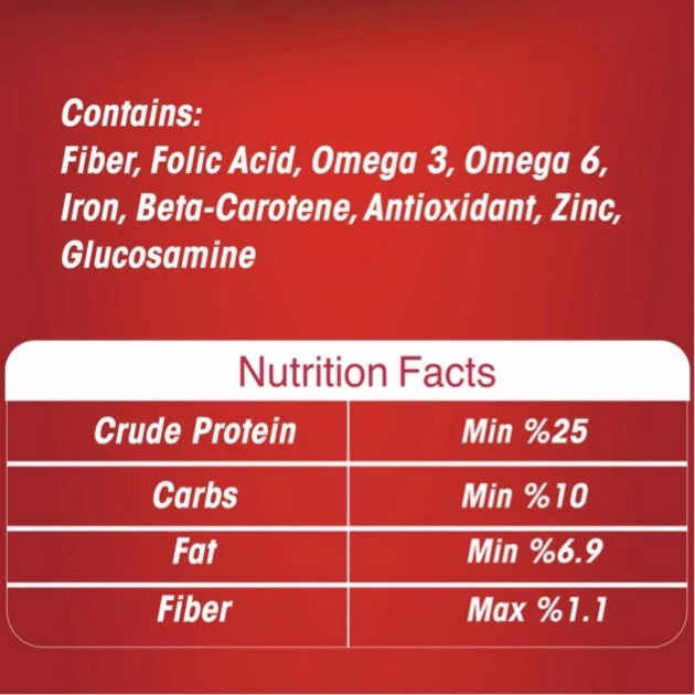 - سایر توضیحاتبهرین زمان استفاده دو سال پس از تولید تولید ۱۴۰۰ ترکیبات:گوشت مرغ،نخود فرنگی،کدو،کاهو،روغن ماهی،پودر استخوان مرغ،برنج،آب،هویج،سیب،جعفری